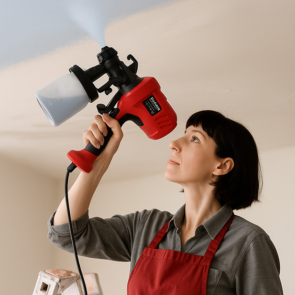 Lo speciale ugello produce una fine nebbia di vernice che si deposita uniformemente, senza strisce o chiazze. Lo strumento crea la sensazione che ogni area si dipinga da sola “come dovrebbe”, indipendentemente dal materiale, dall’esperienza dell’utente o dalla direzione del movimento.